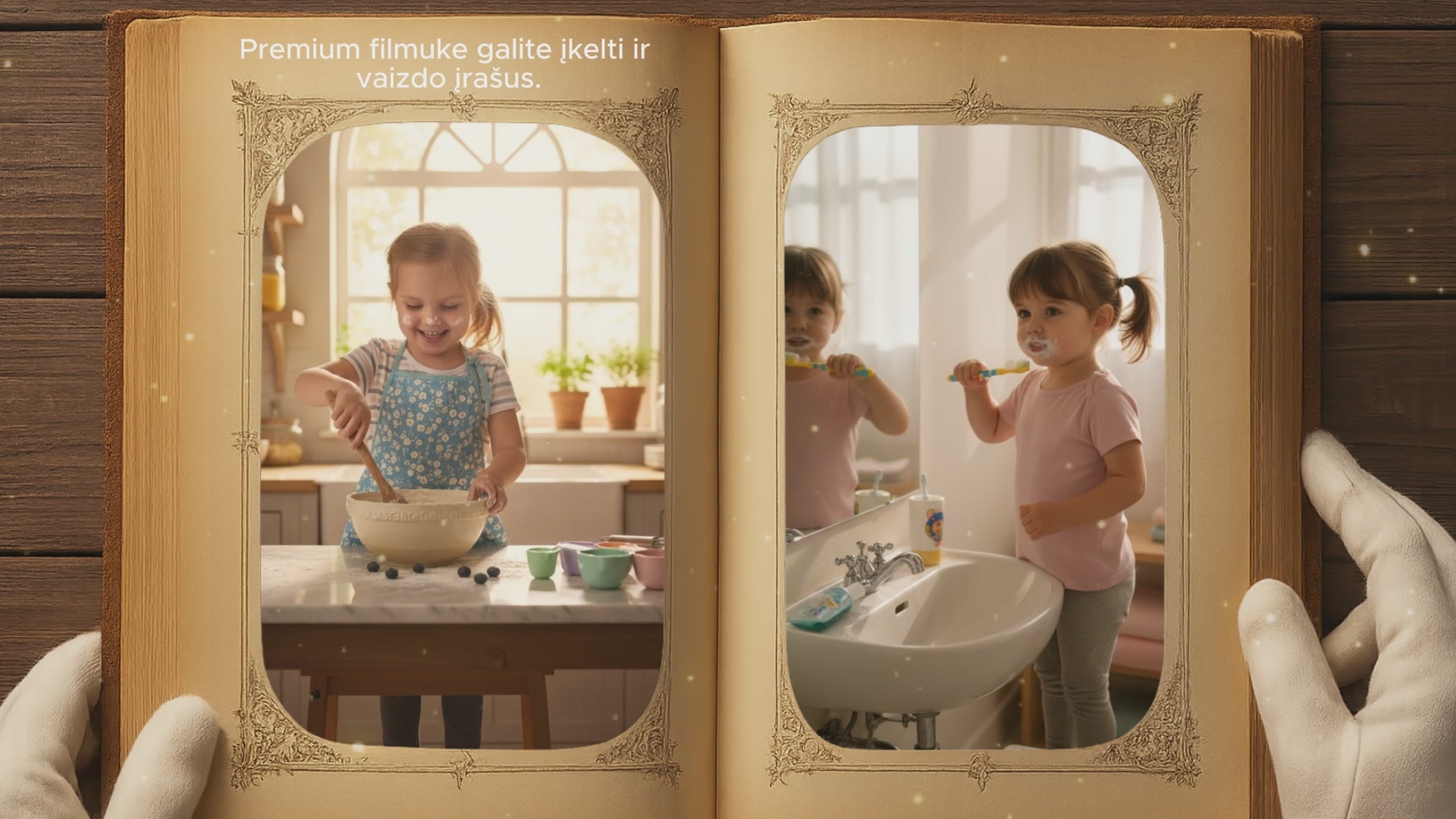 Vaiko nuotraukos ir video akimirkos tampa filmuko istorijos dalimi — jos rodomos Senelio stebuklingoje knygoje.